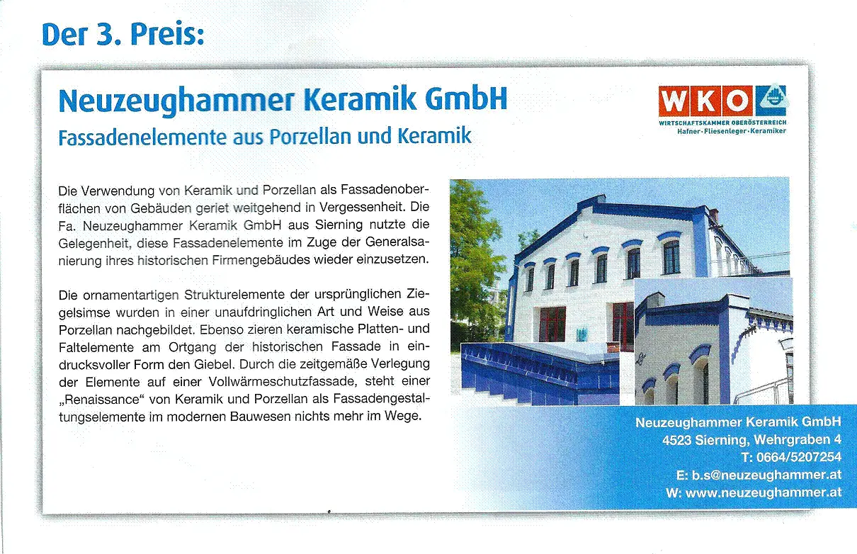 Für die Fassadengestaltung - mit den in Ihrer Manufaktur selbstproduzierten Fassadenelementen - hat Mag. Beate Seckauer den 3. Platz des OÖ Handwerkspreises 2015 gewonnen.